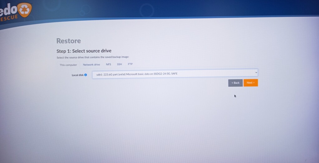 Wählen Sie im nächsten Schritt das Sicherungslaufwerk mit dem erstellten Backup aus und klicken auf Next. Die nächsten Schritte sind analog der des Backups – nur jetzt umgekehrt – also Auswahl der gewünschten Sicherung – Auswahl der zu sichernden Partitionen… Folgen Sie den weiteren Schritt für Schritt Anweisungen…