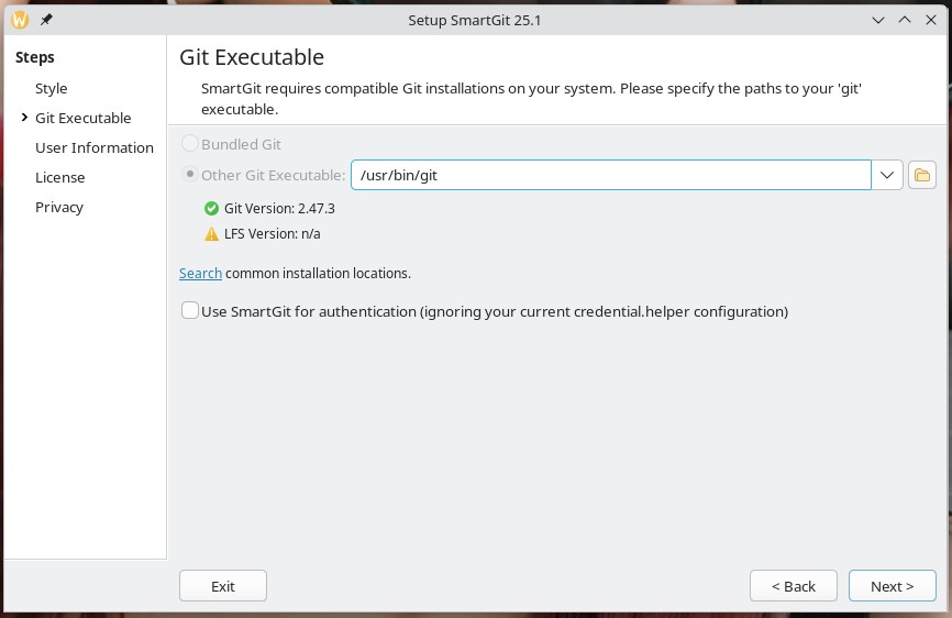 Haben Sie nicht das komplette Bundle genommen, fragt die Software, wo die ausführbare Datei für das Git liegt – in meinem Fall liegt die Software richtig, Sie können dies aber auch auf der Shell mit dem Befehl:
