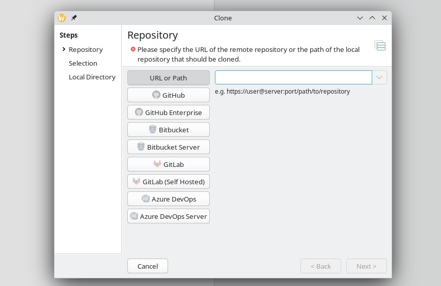 Schon sitzen Sie vor der GUI – leider nicht in Deutsch, vielleicht kommt es noch. Ich habe gerade auf diesem Rechner kein Projekt, daher ziehe ich mir eines von GitHub – Menü „Repository → Clone„: