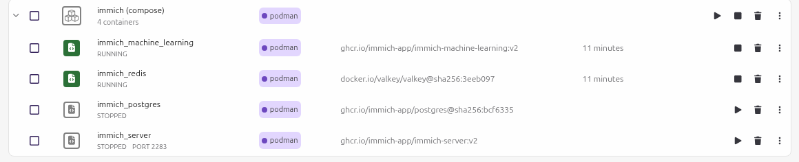 habe es soweit hingekriegt. Nur der Immich Postgres startet nicht. Da ich Podman Desktop verwende hier das Bild dazu: